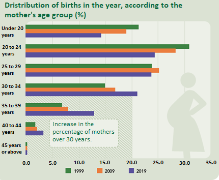 The last two decades marked a structural change in the age in which women had kids. In 1999, the birth records whose mothers had less than 30 years were 76.3% of the total, falling to 62.5% in 2019.