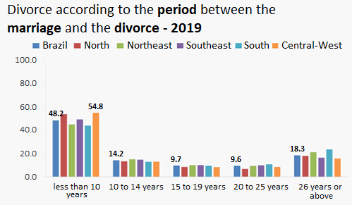 But the length of marriages also decreased in the last decade. In 2019, the average time between the marriage date and the date of the divorce decree or deed was of 13.8 years; in 2009, it had been 17.5 years. Also, 48.2% of the divorces occurred less than 10 years after the marriage.